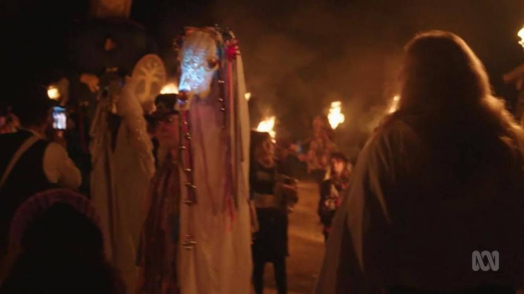 The film captures much loved scenes from the English Ale with its flaming torch bearers, folk costumes, huge giants, green men, and the great Burning Man, as well as, of course, the Morris Dancing. It shows witches dancing about a cauldron at night with the smoke of incense entwined around their legs as they conenct with the magic of the chant. It shows us Druids meditating with trees, sharing music, bringing in the inspiration of Awen, and sharing rituals in nature. There are also shots of Winter Magic in Katoomba, Dark Mofo in Hobart and a dramatic festival of burning a Viking ship.